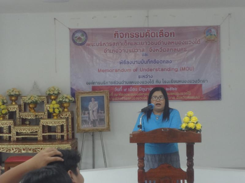 กิจกรรมการคัดเลือกคณะบริหารสภาเด็กและเยาวชนตำบลหนองแวงใต้ และพิธีลงนามบันทึกข้อตกลง (MOU) ว่าด้วยความร่วมมือในการส่งเสริมสนับสนุนศักยภาพบทบาทพพื้นที่สร้างสรรค์สำหรับเด็กและเยาวชนตำบลหนองแวงใต้ เรียน นายกองค์การบริหารส่วนตำบลหนองแวงใต้ เมื่้อวันที่ 9 มิถุนายน 2566 ณ ห้องประชุมองค์การบริหารส่วนตำบลหนองแวงใต้