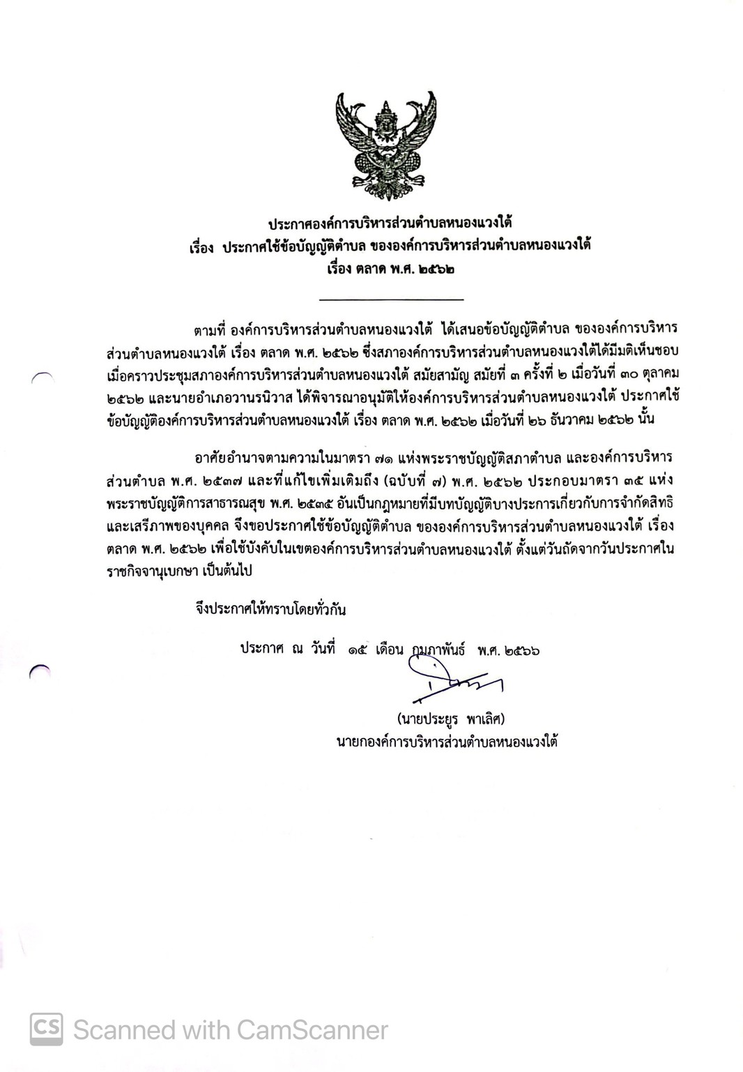 ประกาศใช้ข้อบัญญัติตำบล องค์การบริหารส่วนตำบลหนองแวงใต้ เรื่อง ตลาด พ.ศ.2562