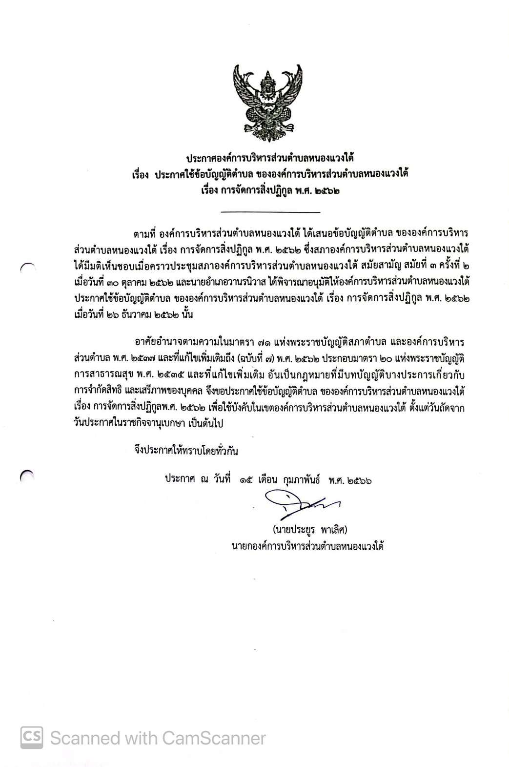 ประกาศใช้ข้อบัญญัติตำบล องค์การบริหารส่วนตำบลหนองแวงใต้ เรื่อง การจัดการสิ่งปฏิกูล พ.ศ.2562