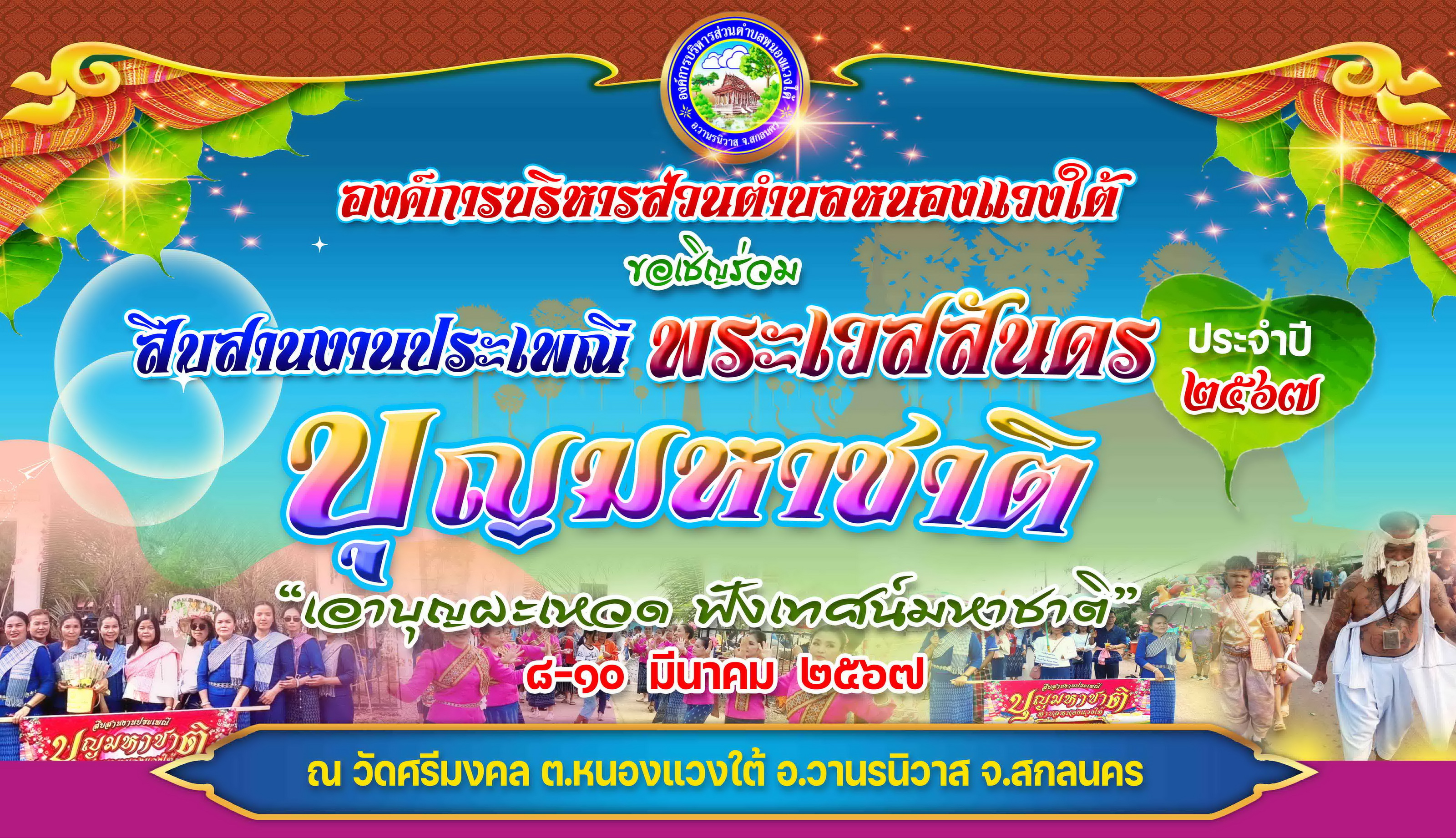 รายละเอียด : ขอเชิญร่วมสืบสานงานประเพณีพระเวสสันดร (บุญมหาชาติ) "เอาบุญผะเหวด ฟังเทศน์มหาชาติ" ประจำปี 2567 ระหว่างวันที่ 8-10 มีนาคม 2567 ณ วัดศรีมงคล ตำบลหนองแวงใต้ อำเภอวานรนิวาส จังหวัดสกลนคร วันที่ 8 มีนาคม 2567 ร่วมขบวนแห่ทั้ง 13 กัณฑ์ ติดต่อสอบถามเพิ่มเติมได้ที่ 042 704 788
