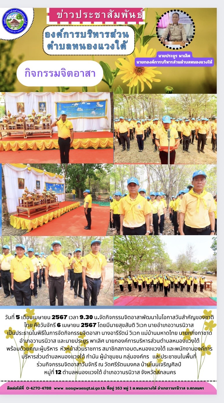 ชื่อเรื่อง : วันที่ 5 เมษายน 2567 เวลา 09.30 น. จัดกิจกรรมจิตอาสาพัฒนาในโอกาสวันสำคัญของชาติไทย คือวันจักรี ในวันที่ 6 เมษายน 2567 โดยมีนายสัขสันติ วิเวก นายอำเภอวานรนิวาส เป็นประธานในพิธี นางอารีรัตน์ วิเวก แม่บ้านมหาดไทย นายกกิ่งกาชาด พร้อมคณะผู้บริหาร หัวหน้าส่วนราชการ สมาชิกสภาอบต. หนองแวงใต้ และพนักงานองค์การบริหารส่วนตำบลหนองแวงใต้ กำนัน ผู้นำชุมชน กลุ่มองค์กร และประชาชนในพื้นที่ ร่วมกิจกรรม ณ วัดศรีรัตนมงคล บ้านโนนเจริญศิลป์ หมู่ 12 ตำบลหนองแวงใต้ อำเภอวานรนิวาส จังหวัดสกลนคร