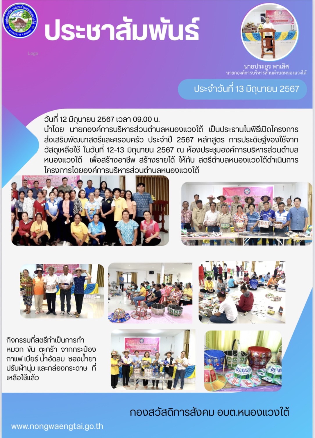 นำโดยนายก องค์การบริหารส่วนตำบลหนองแวงใต้ เป็นประธานในพิธีเปิดโครงการส่งเสริมพัฒนาสตรีและครอบครัว ประจำปี 2567 หลักสูตรการประดิษฐ์ของใช้จากวัสดุเหลือใช้ในวันที่ 12-13 มิถุนายน 2567
