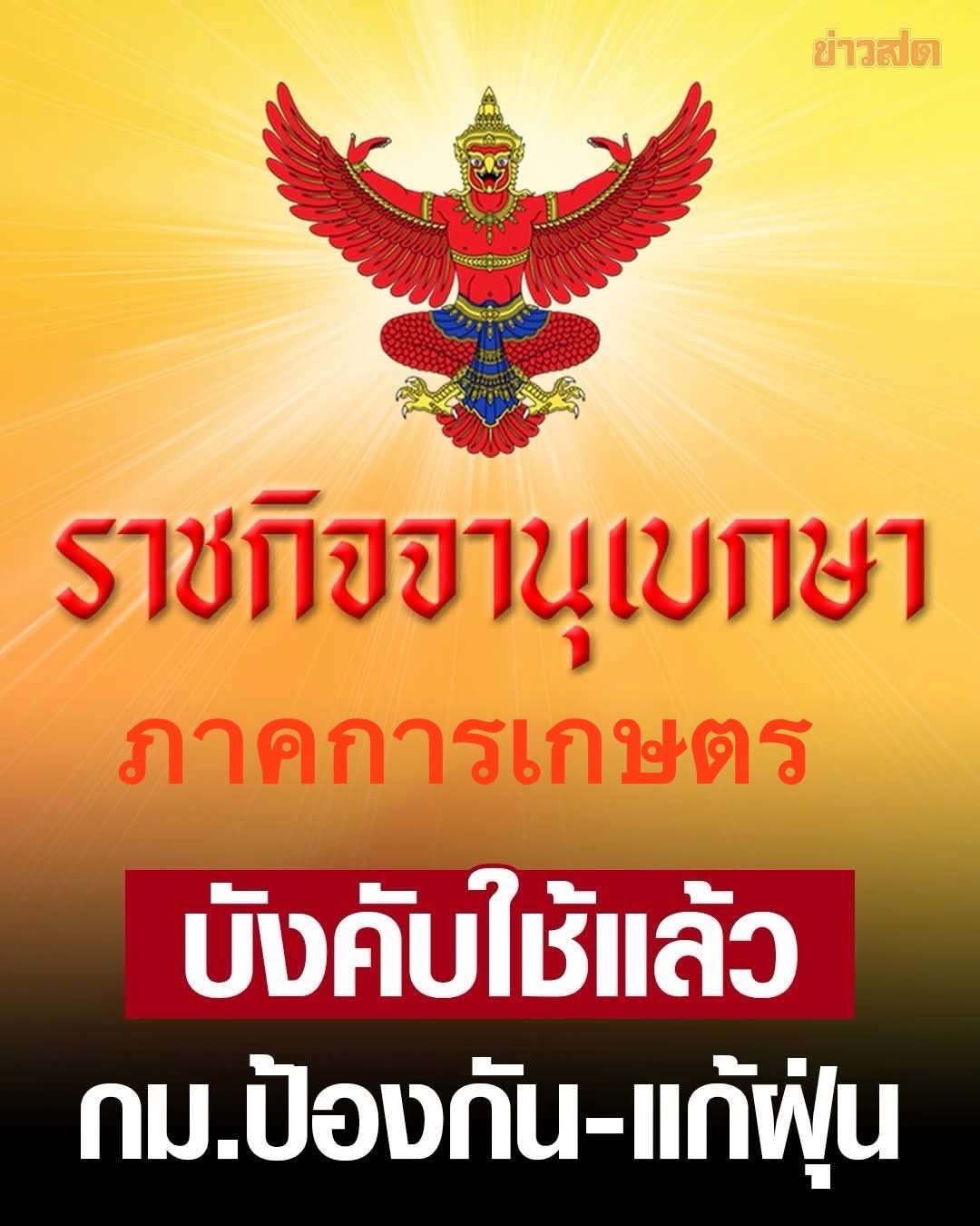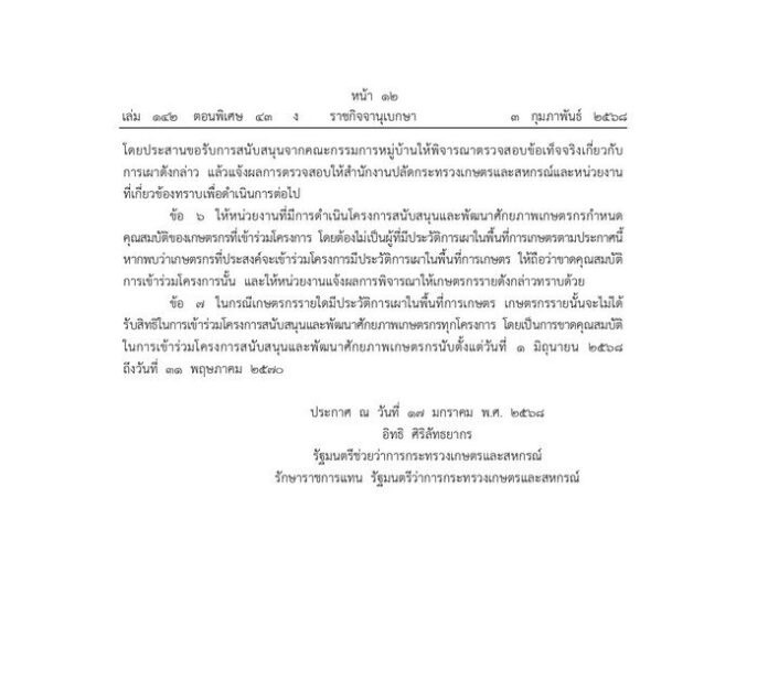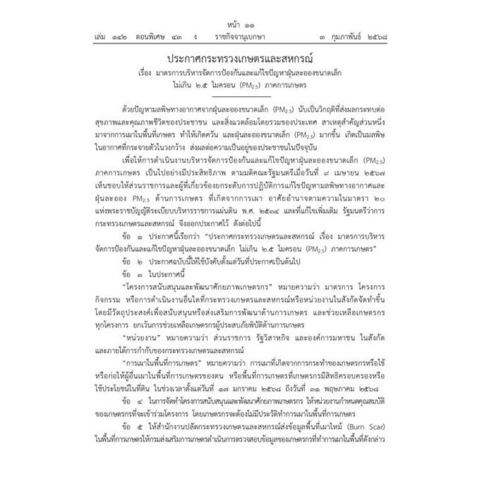 ประกาศกระทรวงเกษตรและสหกรณ์ เรื่อง มาตรกรบริหารจัดการป้องกันแก้ไขปัญหาฝุ่นละอองขนาดเล็ก