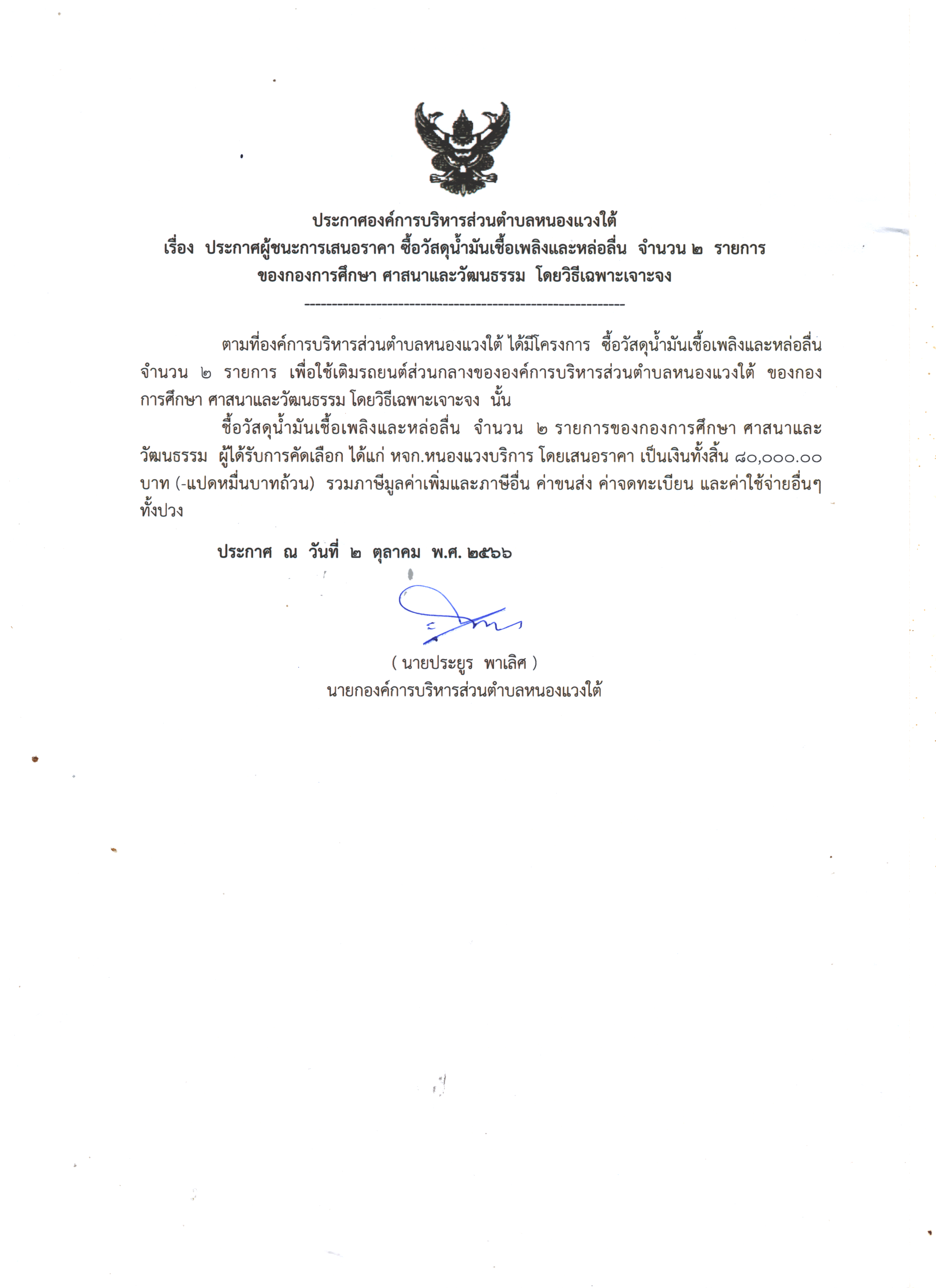 ประกาศผู้ชนะ ซื้อวัสดุน้ำมันเชื้อเพลิงและหล่อลื่น จำนวน 2 รายการ ของกองการศึกษาฯ